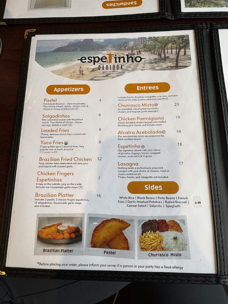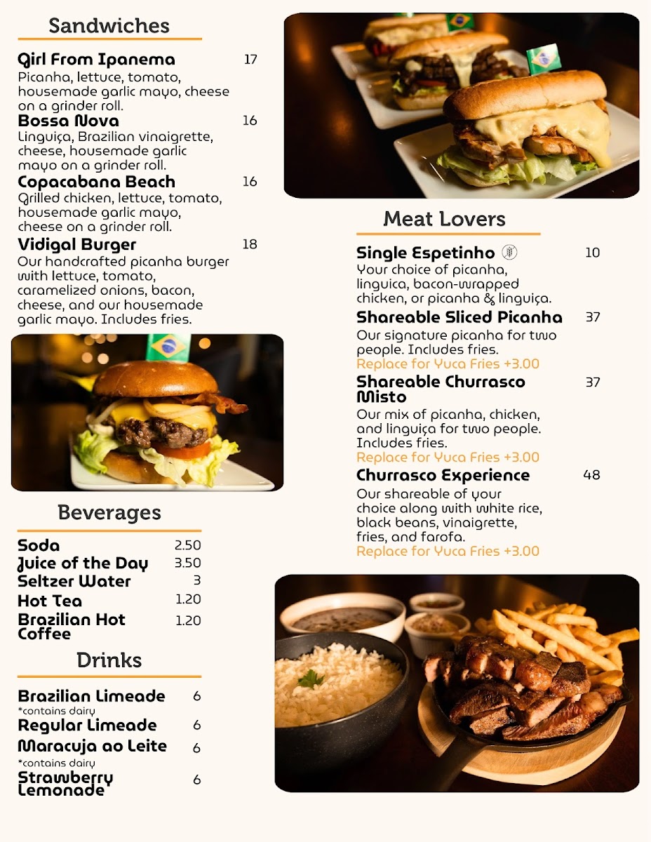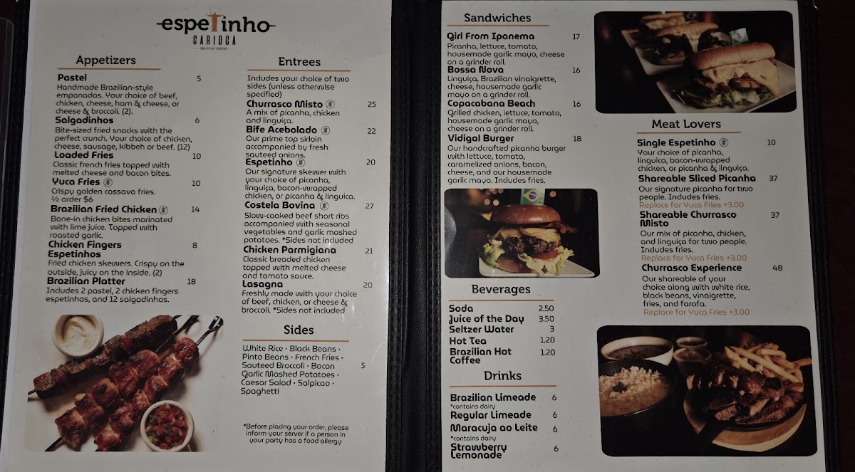 Espetinho Carioca offers a menu that’s a vibrant snapshot of Brazilian flavors, giving diners a variety of options from snacks to hearty mains. The Lunch Buffet by Pound allows you to sample a bit of everything, making it a perfect choice for indecisive eaters. For starters, the Pastel, Salgadinhos, Loaded Fries, Yuca Fries, and Brazilian Fried Chicken offer a satisfying mix of crispy, savory bites. Main courses include Churrasco Misto, Chicken Parmigiana, Alcatra Acebolada Espetinho, and Lasagna, catering to both traditional Brazilian tastes and familiar comfort foods. The sandwich selection-Girl From Ipanema, Bossa Nova, and Copacabana Beach-adds a playful, portable option to the menu. Meat enthusiasts will appreciate the Single Espetinho, Shareable Sliced Picanha, and Shareable Churrasco Misto, which deliver generous portions of grilled meats. Desserts like Brazilian-Style Flan, Churros, Pineapple Mousse, Passion Fruit Mousse, and Nido Milk Ice Cream offer sweet, tropical finales, while the drink options-Soda, Juice of the Day, and Non Alcoholic Beer-round out a menu designed for both casual meals and indulgent feasts. Overall, Espetinho Carioca balances authenticity with approachability, making it a flavorful stop for anyone craving Brazilian cuisine.