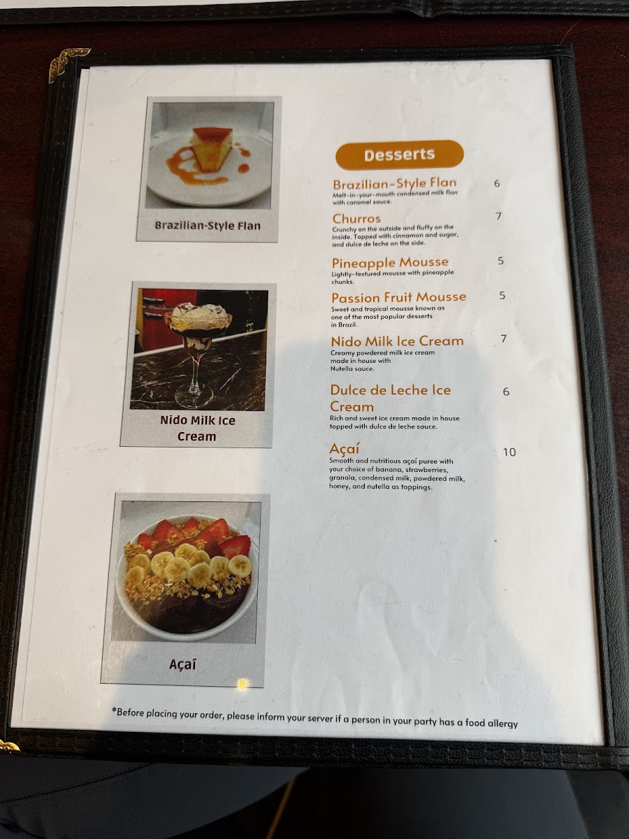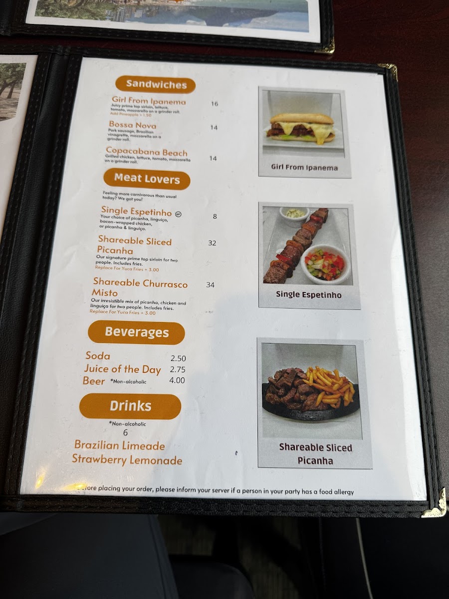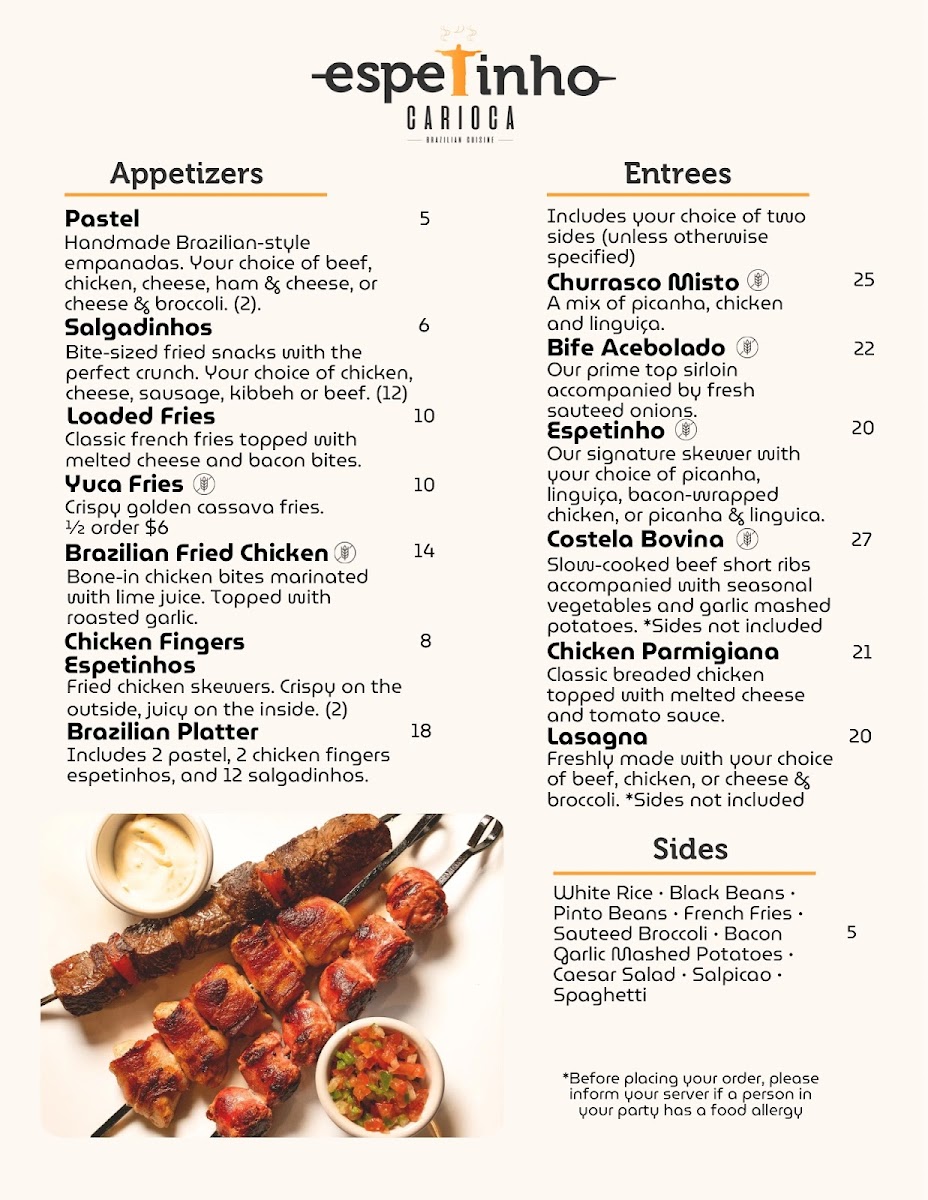 Espetinho Carioca offers a menu that’s a vibrant snapshot of Brazilian flavors, giving diners a variety of options from snacks to hearty mains. The Lunch Buffet by Pound allows you to sample a bit of everything, making it a perfect choice for indecisive eaters. For starters, the Pastel, Salgadinhos, Loaded Fries, Yuca Fries, and Brazilian Fried Chicken offer a satisfying mix of crispy, savory bites. Main courses include Churrasco Misto, Chicken Parmigiana, Alcatra Acebolada Espetinho, and Lasagna, catering to both traditional Brazilian tastes and familiar comfort foods. The sandwich selection-Girl From Ipanema, Bossa Nova, and Copacabana Beach-adds a playful, portable option to the menu. Meat enthusiasts will appreciate the Single Espetinho, Shareable Sliced Picanha, and Shareable Churrasco Misto, which deliver generous portions of grilled meats. Desserts like Brazilian-Style Flan, Churros, Pineapple Mousse, Passion Fruit Mousse, and Nido Milk Ice Cream offer sweet, tropical finales, while the drink options-Soda, Juice of the Day, and Non Alcoholic Beer-round out a menu designed for both casual meals and indulgent feasts. Overall, Espetinho Carioca balances authenticity with approachability, making it a flavorful stop for anyone craving Brazilian cuisine.